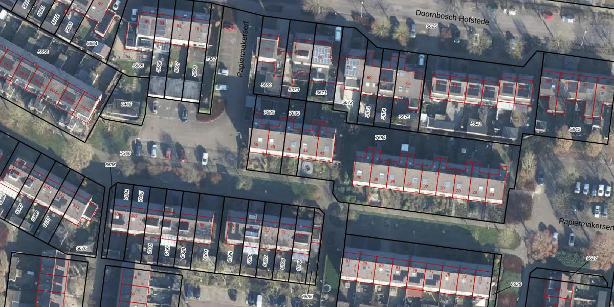 Het perceel waarop Papiermakerserf 44 staat heeft een oppervlakte van 1846 m². Dit is een zeer groot perceel. De perceeloppervlakte wordt geregistreerd door het Kadaster. Gedetailleerde informatie over de maten van dit perceel kunt u vinden in het rapport Kadastrale kaart met maatvoering van Papiermakerserf 44.