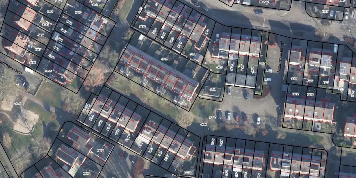 Het perceel waarop Papiermakerserf 54 staat heeft een oppervlakte van 1247 m². Dit is een zeer groot perceel. De perceeloppervlakte wordt geregistreerd door het Kadaster. Gedetailleerde informatie over de maten van dit perceel kunt u vinden in het rapport Kadastrale kaart met maatvoering van Papiermakerserf 54.