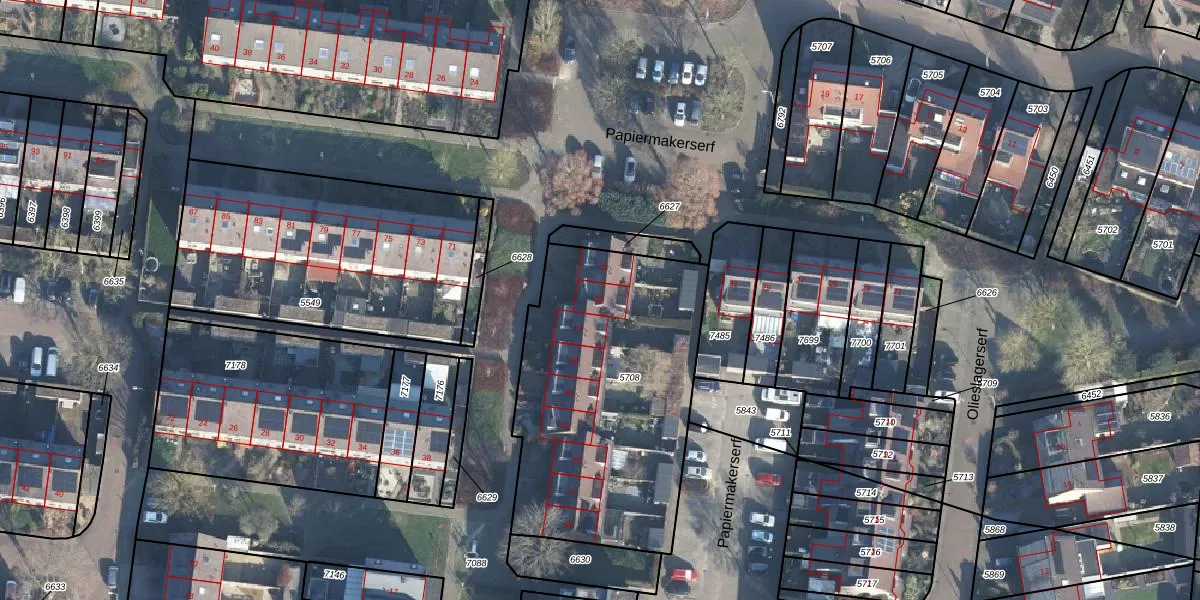 Het perceel waarop Papiermakerserf 55 staat heeft een oppervlakte van 1366 m². Dit is een zeer groot perceel. De perceeloppervlakte wordt geregistreerd door het Kadaster. Gedetailleerde informatie over de maten van dit perceel kunt u vinden in het rapport Kadastrale kaart met maatvoering van Papiermakerserf 55.