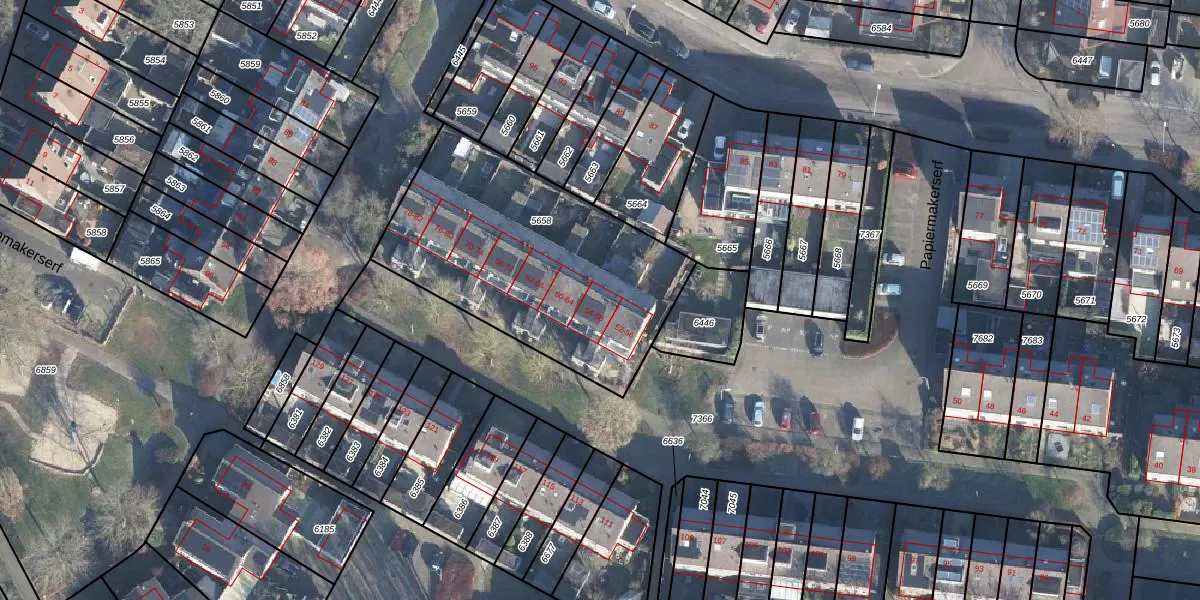 Het perceel waarop Papiermakerserf 58 staat heeft een oppervlakte van 1247 m². Dit is een zeer groot perceel. De perceeloppervlakte wordt geregistreerd door het Kadaster. Gedetailleerde informatie over de maten van dit perceel kunt u vinden in het rapport Kadastrale kaart met maatvoering van Papiermakerserf 58.