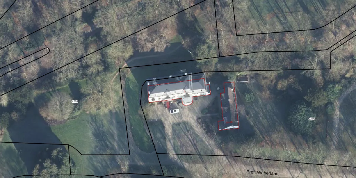 Het perceel waarop Prof. Weberlaan 1 staat heeft een oppervlakte van 9825 m². Dit is een zeer groot perceel. De perceeloppervlakte wordt geregistreerd door het Kadaster. Gedetailleerde informatie over de maten van dit perceel kunt u vinden in het rapport Kadastrale kaart met maatvoering van Prof. Weberlaan 1.