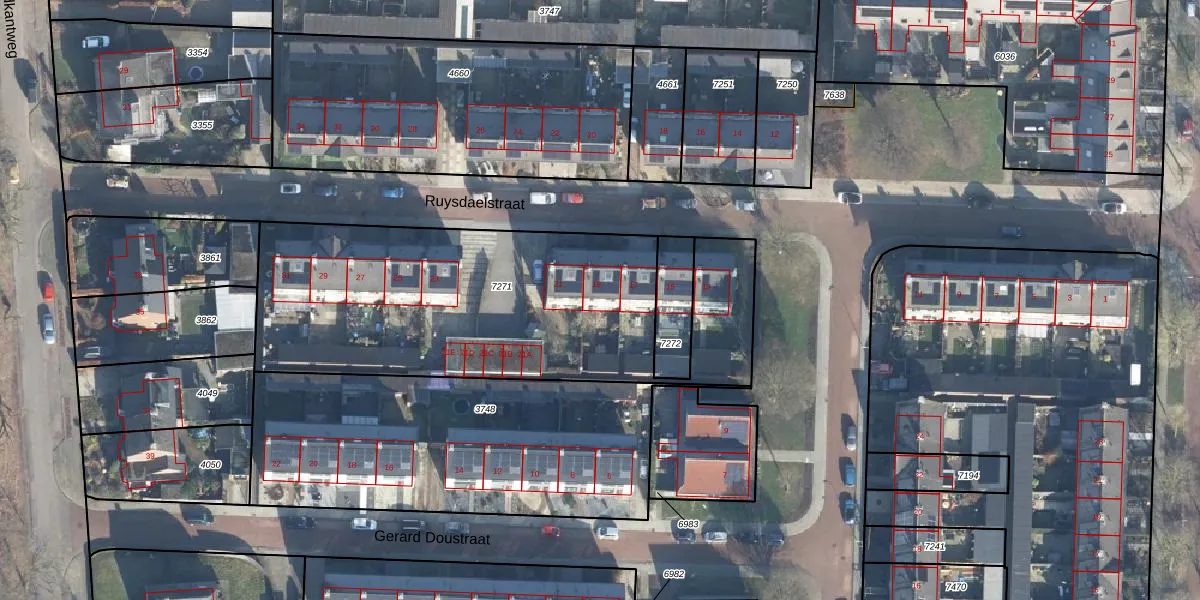 Het perceel waarop Ruysdaelstraat 19 staat heeft een oppervlakte van 1900 m². Dit is een zeer groot perceel. De perceeloppervlakte wordt geregistreerd door het Kadaster. Gedetailleerde informatie over de maten van dit perceel kunt u vinden in het rapport Kadastrale kaart met maatvoering van Ruysdaelstraat 19.