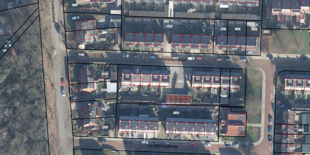 Het perceel waarop Ruysdaelstraat 25 staat heeft een oppervlakte van 1900 m². Dit is een zeer groot perceel. De perceeloppervlakte wordt geregistreerd door het Kadaster. Gedetailleerde informatie over de maten van dit perceel kunt u vinden in het rapport Kadastrale kaart met maatvoering van Ruysdaelstraat 25.