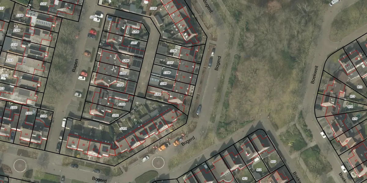 Het perceel waarop Bogerd 50 staat heeft een oppervlakte van 151 m². Dit is een middelgroot perceel. De perceeloppervlakte wordt geregistreerd door het Kadaster. Gedetailleerde informatie over de maten van dit perceel kunt u vinden in het rapport Kadastrale kaart met maatvoering van Bogerd 50.