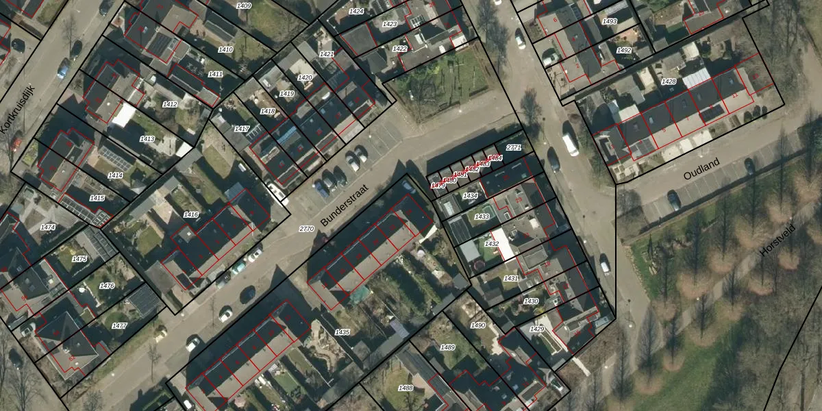 Het perceel waarop Bunderstraat 24 staat heeft een oppervlakte van 2337 m². Dit is een zeer groot perceel. De perceeloppervlakte wordt geregistreerd door het Kadaster. Gedetailleerde informatie over de maten van dit perceel kunt u vinden in het rapport Kadastrale kaart met maatvoering van Bunderstraat 24.