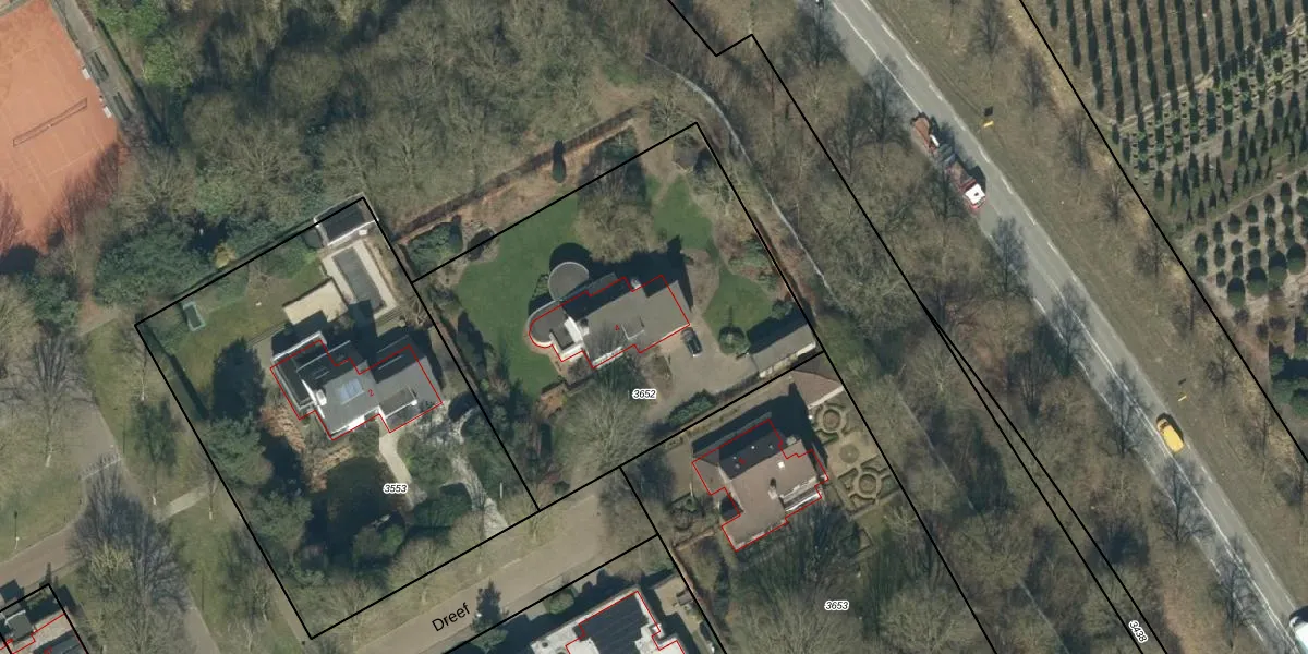 Het perceel waarop Dreef 4 staat heeft een oppervlakte van 2000 m². Dit is een zeer groot perceel. De perceeloppervlakte wordt geregistreerd door het Kadaster. Gedetailleerde informatie over de maten van dit perceel kunt u vinden in het rapport Kadastrale kaart met maatvoering van Dreef 4.