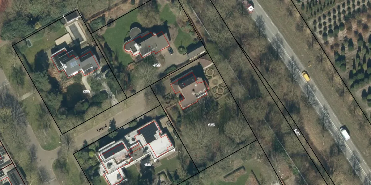 Het perceel waarop Dreef 6 staat heeft een oppervlakte van 1945 m². Dit is een zeer groot perceel. De perceeloppervlakte wordt geregistreerd door het Kadaster. Gedetailleerde informatie over de maten van dit perceel kunt u vinden in het rapport Kadastrale kaart met maatvoering van Dreef 6.