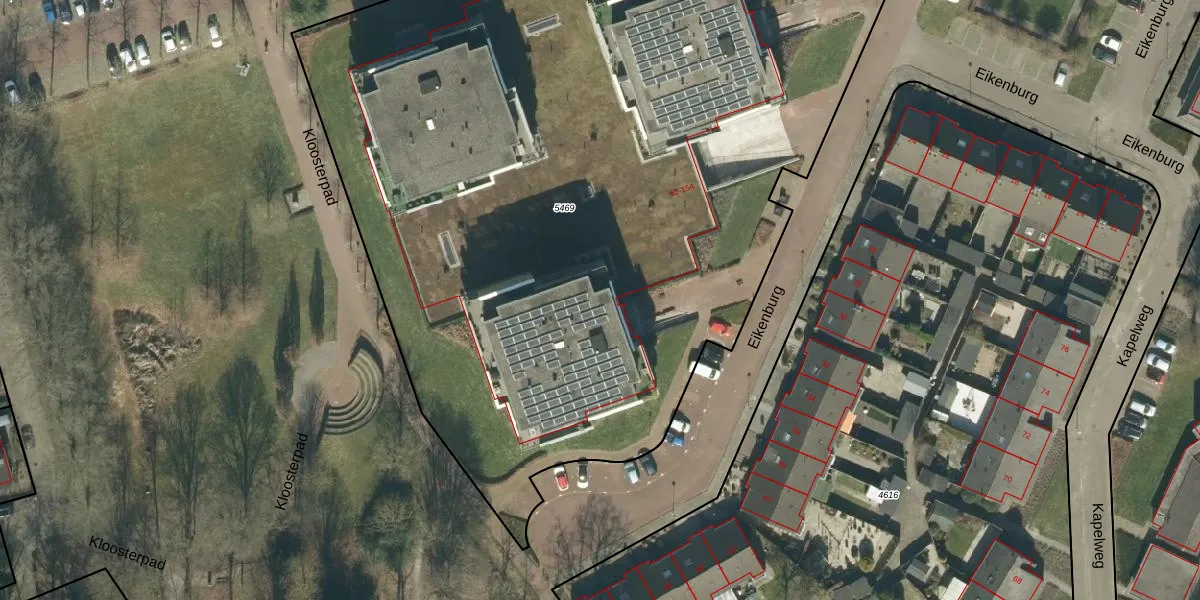 Het perceel waarop Eikenburg 60 staat heeft een oppervlakte van 6332 m². Dit is een zeer groot perceel. De perceeloppervlakte wordt geregistreerd door het Kadaster. Gedetailleerde informatie over de maten van dit perceel kunt u vinden in het rapport Kadastrale kaart met maatvoering van Eikenburg 60.
