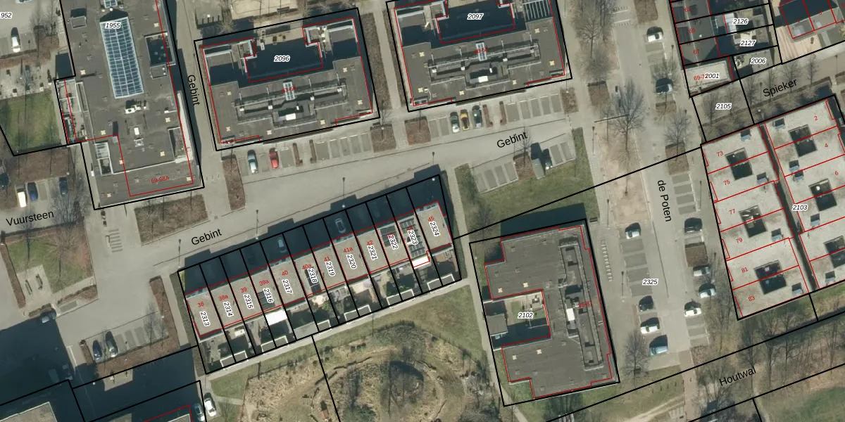 Het perceel waarop Gebint 45 staat heeft een oppervlakte van 163 m². Dit is een middelgroot perceel. De perceeloppervlakte wordt geregistreerd door het Kadaster. Gedetailleerde informatie over de maten van dit perceel kunt u vinden in het rapport Kadastrale kaart met maatvoering van Gebint 45.