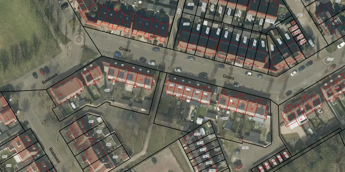 Het perceel waarop Groes 18 staat heeft een oppervlakte van 1853 m². Dit is een zeer groot perceel. De perceeloppervlakte wordt geregistreerd door het Kadaster. Gedetailleerde informatie over de maten van dit perceel kunt u vinden in het rapport Kadastrale kaart met maatvoering van Groes 18.