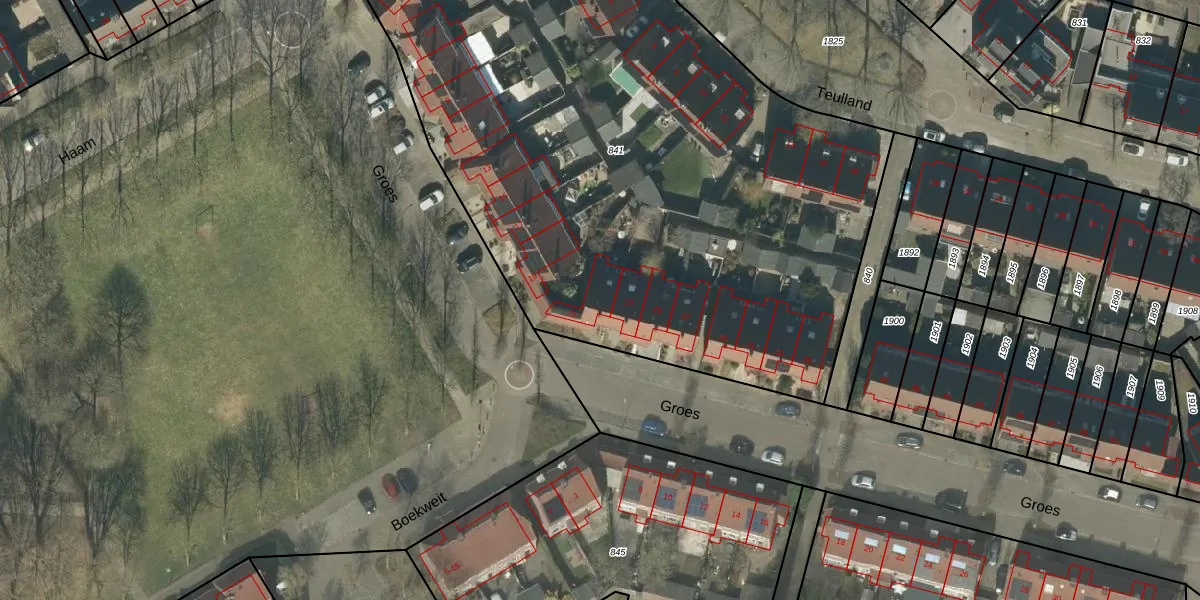 Het perceel waarop Groes 21 staat heeft een oppervlakte van 4587 m². Dit is een zeer groot perceel. De perceeloppervlakte wordt geregistreerd door het Kadaster. Gedetailleerde informatie over de maten van dit perceel kunt u vinden in het rapport Kadastrale kaart met maatvoering van Groes 21.