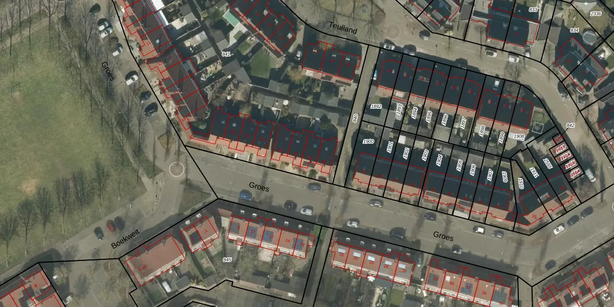 Het perceel waarop Groes 33 staat heeft een oppervlakte van 4587 m². Dit is een zeer groot perceel. De perceeloppervlakte wordt geregistreerd door het Kadaster. Gedetailleerde informatie over de maten van dit perceel kunt u vinden in het rapport Kadastrale kaart met maatvoering van Groes 33.