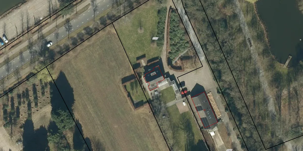 Het perceel waarop Hees 1 staat heeft een oppervlakte van 4215 m². Dit is een zeer groot perceel. De perceeloppervlakte wordt geregistreerd door het Kadaster. Gedetailleerde informatie over de maten van dit perceel kunt u vinden in het rapport Kadastrale kaart met maatvoering van Hees 1.