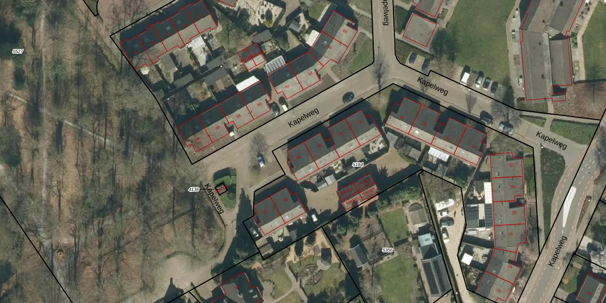 Het perceel waarop Kapelweg 48 staat heeft een oppervlakte van 3364 m². Dit is een zeer groot perceel. De perceeloppervlakte wordt geregistreerd door het Kadaster. Gedetailleerde informatie over de maten van dit perceel kunt u vinden in het rapport Kadastrale kaart met maatvoering van Kapelweg 48.