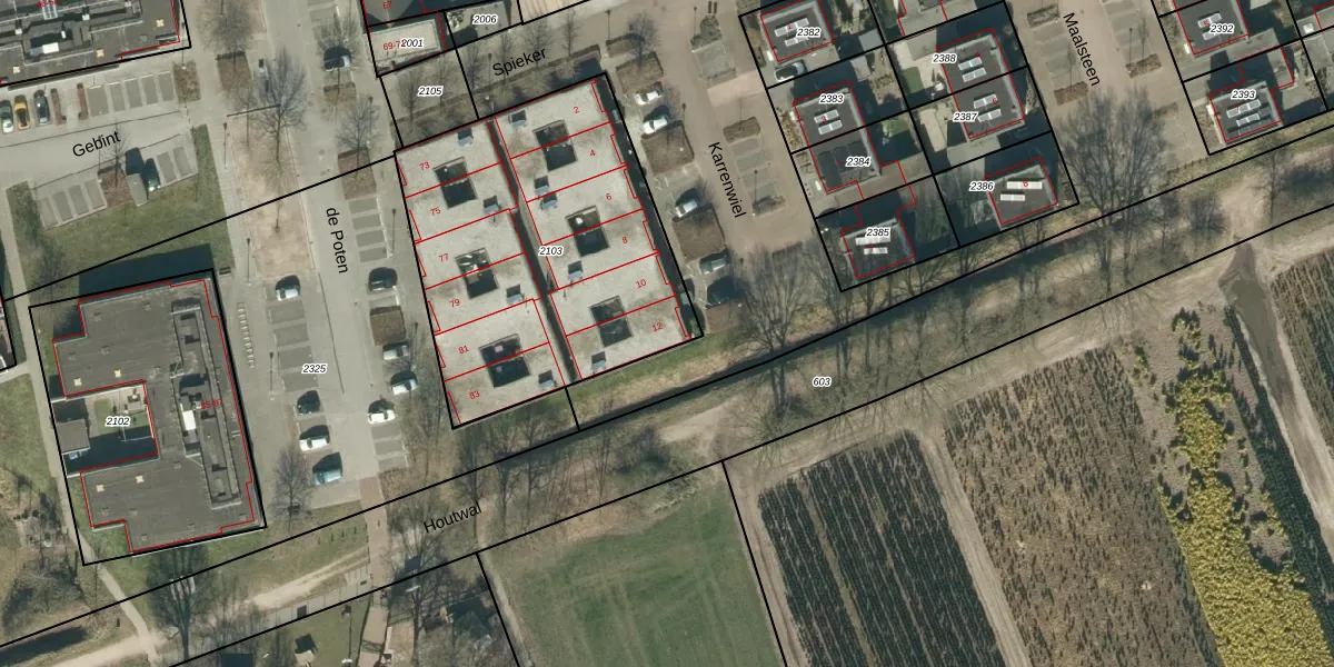 Karrenwiel 12 is gelegen op kadastraal perceel ESL00M2103. Deze kadastrale aanduiding is uniek en wordt gebruikt door het Kadaster om eigendomsrechten en andere zakelijke rechten vast te leggen. Het perceel maakt onderdeel uit van de kadastrale gemeente Eersel.