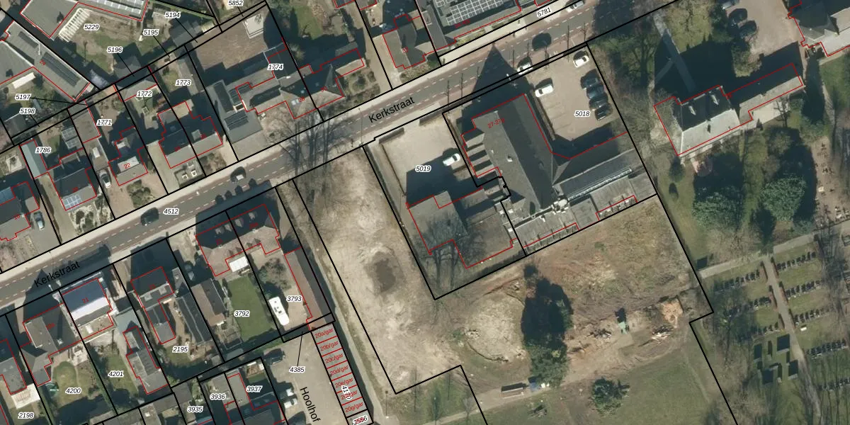 Het perceel waarop Kerkstraat 27 staat heeft een oppervlakte van 942 m². Dit is een groot perceel. De perceeloppervlakte wordt geregistreerd door het Kadaster. Gedetailleerde informatie over de maten van dit perceel kunt u vinden in het rapport Kadastrale kaart met maatvoering van Kerkstraat 27.