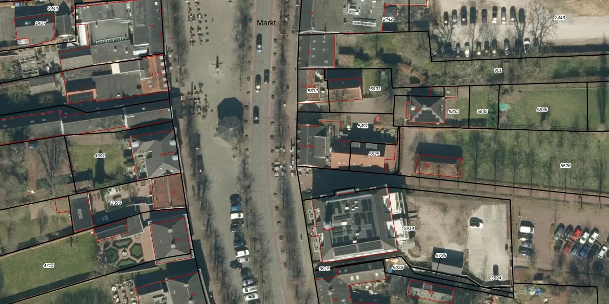 Het perceel waarop Markt 26 staat heeft een oppervlakte van 475 m². Dit is een groot perceel. De perceeloppervlakte wordt geregistreerd door het Kadaster. Gedetailleerde informatie over de maten van dit perceel kunt u vinden in het rapport Kadastrale kaart met maatvoering van Markt 26.