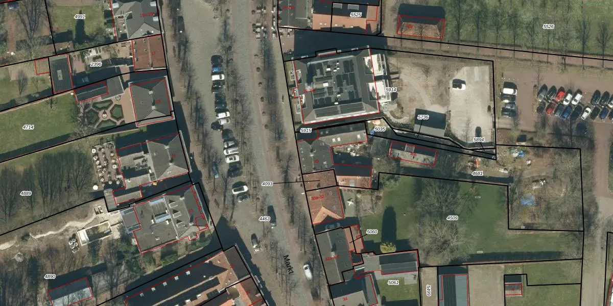 Het perceel waarop Markt 30 staat heeft een oppervlakte van 1468 m². Dit is een zeer groot perceel. De perceeloppervlakte wordt geregistreerd door het Kadaster. Gedetailleerde informatie over de maten van dit perceel kunt u vinden in het rapport Kadastrale kaart met maatvoering van Markt 30.