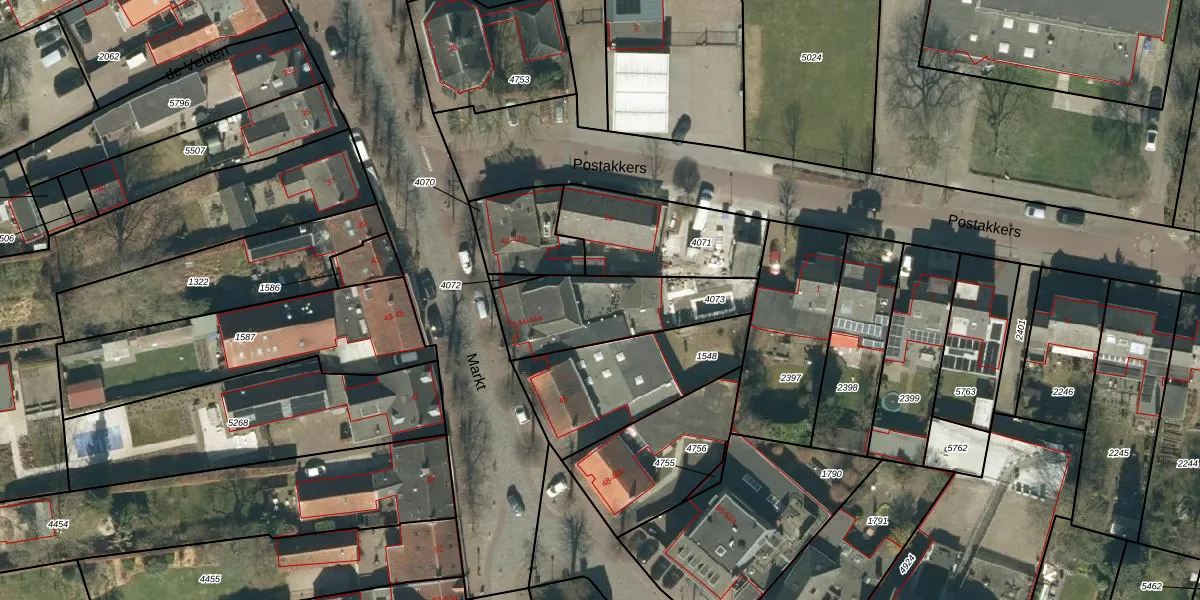 Het perceel waarop Markt 44-a staat heeft een oppervlakte van 427 m². Dit is een groot perceel. De perceeloppervlakte wordt geregistreerd door het Kadaster. Gedetailleerde informatie over de maten van dit perceel kunt u vinden in het rapport Kadastrale kaart met maatvoering van Markt 44-a.