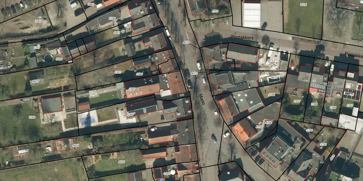 Het perceel waarop Markt 45 staat heeft een oppervlakte van 745 m². Dit is een groot perceel. De perceeloppervlakte wordt geregistreerd door het Kadaster. Gedetailleerde informatie over de maten van dit perceel kunt u vinden in het rapport Kadastrale kaart met maatvoering van Markt 45.