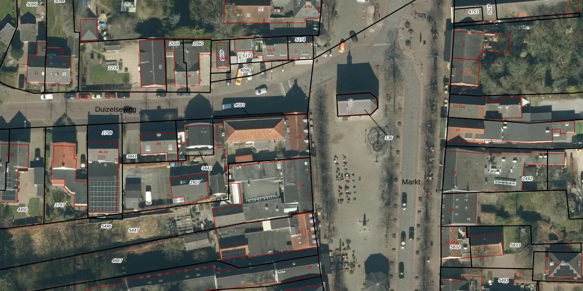 Het perceel waarop Markt 5 staat heeft een oppervlakte van 1090 m². Dit is een zeer groot perceel. De perceeloppervlakte wordt geregistreerd door het Kadaster. Gedetailleerde informatie over de maten van dit perceel kunt u vinden in het rapport Kadastrale kaart met maatvoering van Markt 5.