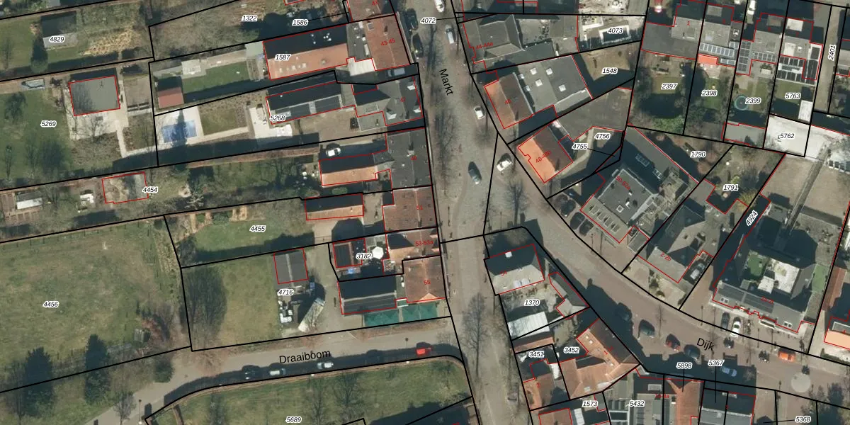 Het perceel waarop Markt 51 staat heeft een oppervlakte van 710 m². Dit is een groot perceel. De perceeloppervlakte wordt geregistreerd door het Kadaster. Gedetailleerde informatie over de maten van dit perceel kunt u vinden in het rapport Kadastrale kaart met maatvoering van Markt 51.