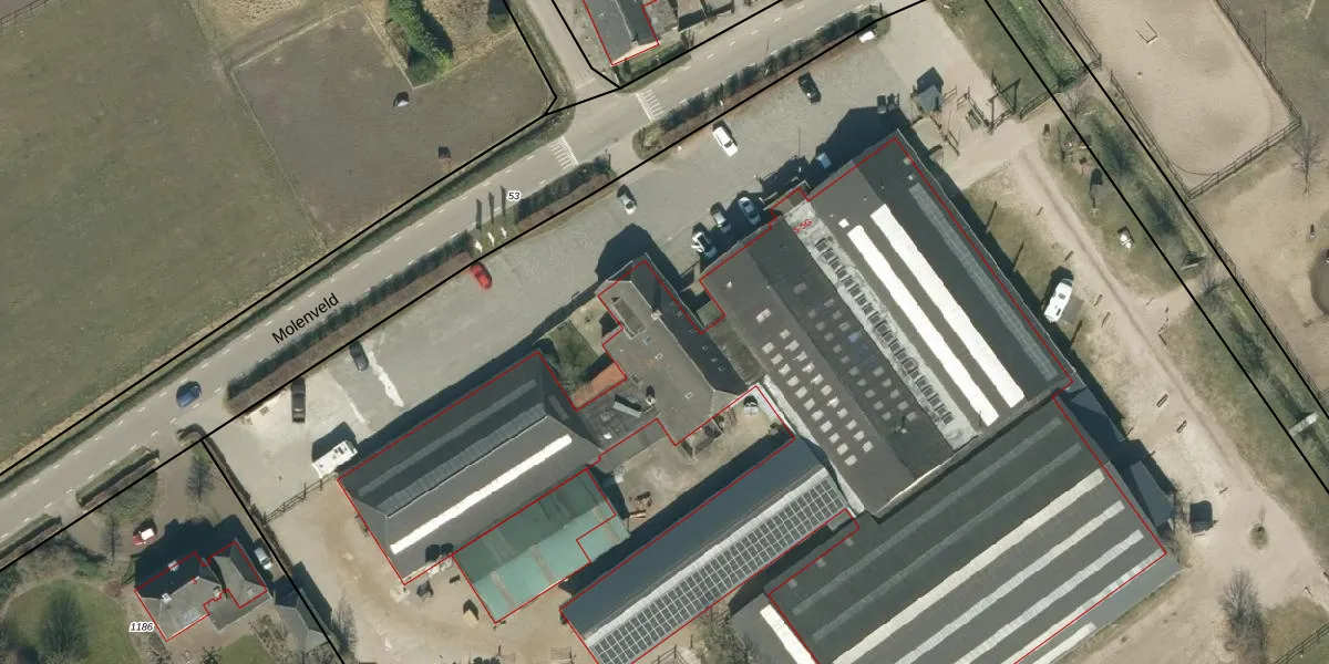 Het perceel waarop Molenveld 5-b staat heeft een oppervlakte van 2,9 ha. Dit is een zeer groot perceel. De perceeloppervlakte wordt geregistreerd door het Kadaster. Gedetailleerde informatie over de maten van dit perceel kunt u vinden in het rapport Kadastrale kaart met maatvoering van Molenveld 5-b.