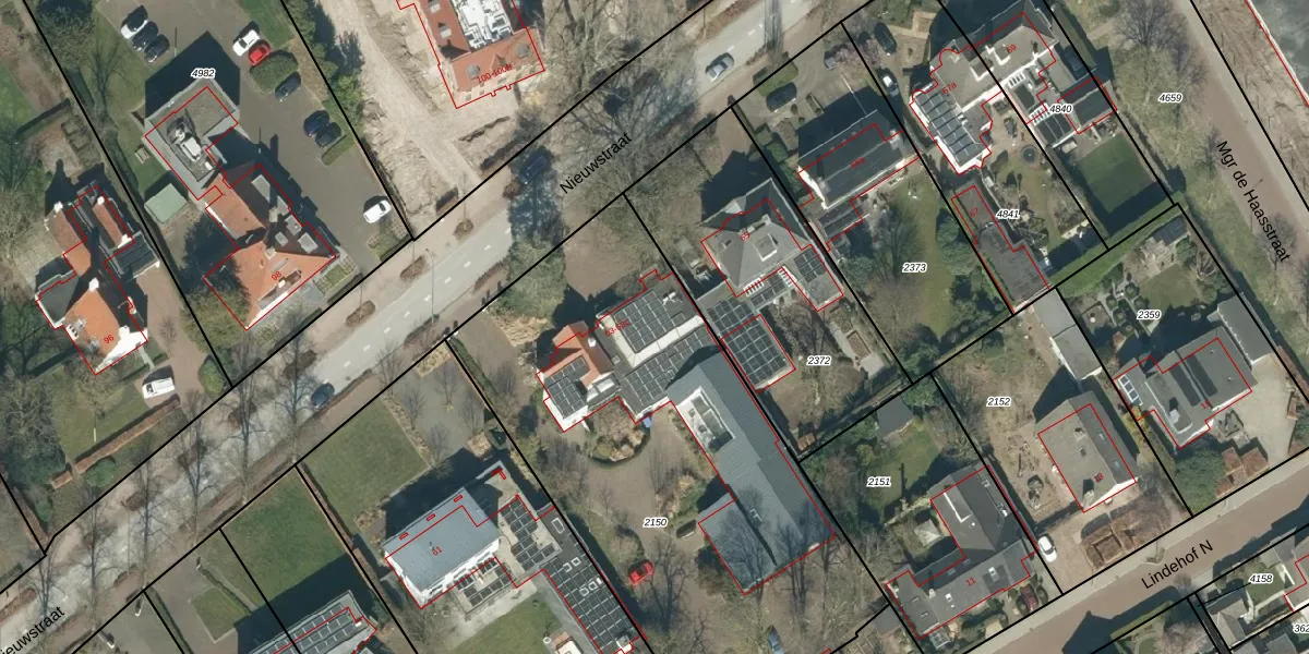 Het perceel waarop Nieuwstraat 63-A staat heeft een oppervlakte van 2565 m². Dit is een zeer groot perceel. De perceeloppervlakte wordt geregistreerd door het Kadaster. Gedetailleerde informatie over de maten van dit perceel kunt u vinden in het rapport Kadastrale kaart met maatvoering van Nieuwstraat 63-A.