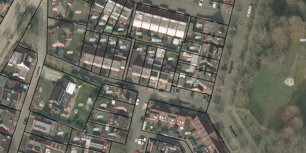 Het perceel waarop Rapen 33 staat heeft een oppervlakte van 159 m². Dit is een middelgroot perceel. De perceeloppervlakte wordt geregistreerd door het Kadaster. Gedetailleerde informatie over de maten van dit perceel kunt u vinden in het rapport Kadastrale kaart met maatvoering van Rapen 33.