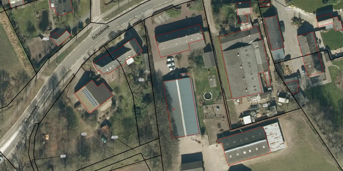 Het perceel waarop Schadewijk 9-a staat heeft een oppervlakte van 1,2 ha. Dit is een zeer groot perceel. De perceeloppervlakte wordt geregistreerd door het Kadaster. Gedetailleerde informatie over de maten van dit perceel kunt u vinden in het rapport Kadastrale kaart met maatvoering van Schadewijk 9-a.