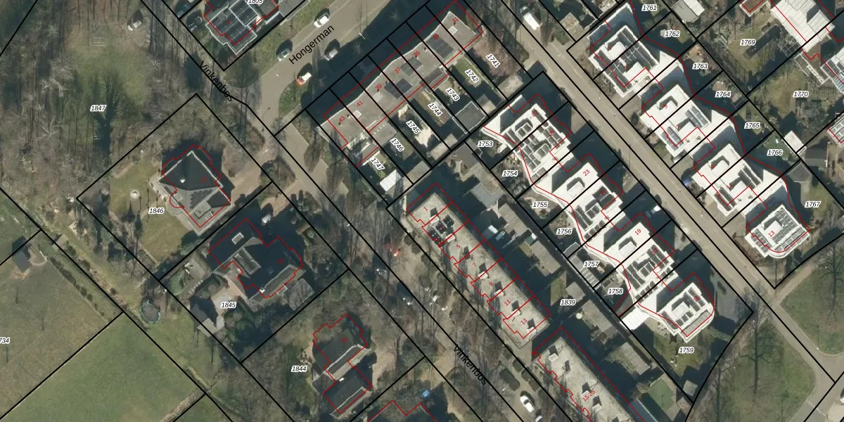 Het perceel waarop Vinkenbos 1 staat heeft een oppervlakte van 2189 m². Dit is een zeer groot perceel. De perceeloppervlakte wordt geregistreerd door het Kadaster. Gedetailleerde informatie over de maten van dit perceel kunt u vinden in het rapport Kadastrale kaart met maatvoering van Vinkenbos 1.
