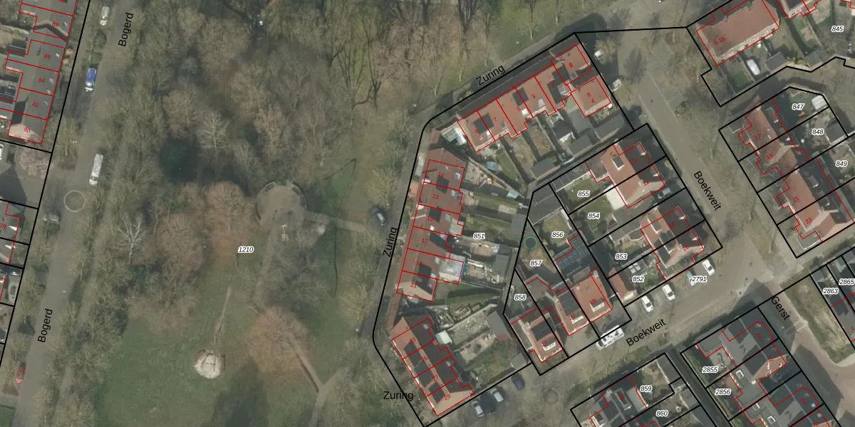 Het perceel waarop Zuring 15 staat heeft een oppervlakte van 2640 m². Dit is een zeer groot perceel. De perceeloppervlakte wordt geregistreerd door het Kadaster. Gedetailleerde informatie over de maten van dit perceel kunt u vinden in het rapport Kadastrale kaart met maatvoering van Zuring 15.