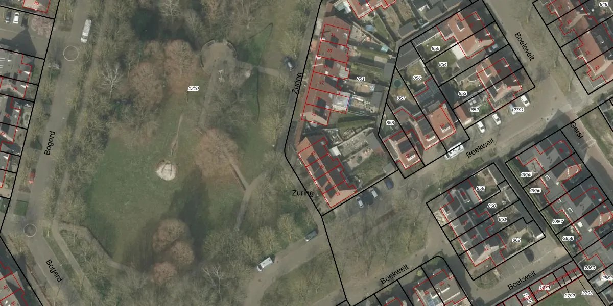 Het perceel waarop Zuring 23 staat heeft een oppervlakte van 2640 m². Dit is een zeer groot perceel. De perceeloppervlakte wordt geregistreerd door het Kadaster. Gedetailleerde informatie over de maten van dit perceel kunt u vinden in het rapport Kadastrale kaart met maatvoering van Zuring 23.
