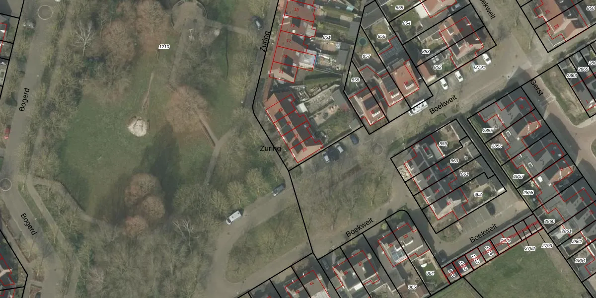 Het perceel waarop Zuring 29 staat heeft een oppervlakte van 2640 m². Dit is een zeer groot perceel. De perceeloppervlakte wordt geregistreerd door het Kadaster. Gedetailleerde informatie over de maten van dit perceel kunt u vinden in het rapport Kadastrale kaart met maatvoering van Zuring 29.