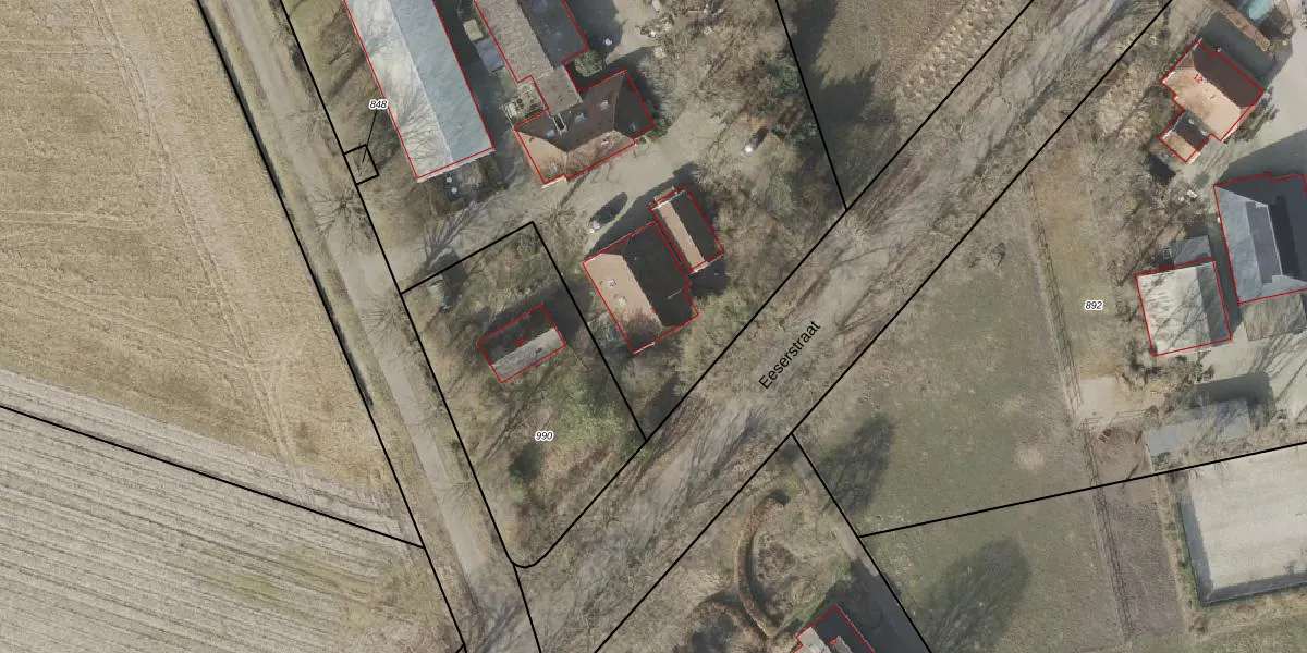 Het perceel waarop Eeserstraat 7 staat heeft een oppervlakte van 6190 m². Dit is een zeer groot perceel. De perceeloppervlakte wordt geregistreerd door het Kadaster. Gedetailleerde informatie over de maten van dit perceel kunt u vinden in het rapport Kadastrale kaart met maatvoering van Eeserstraat 7.