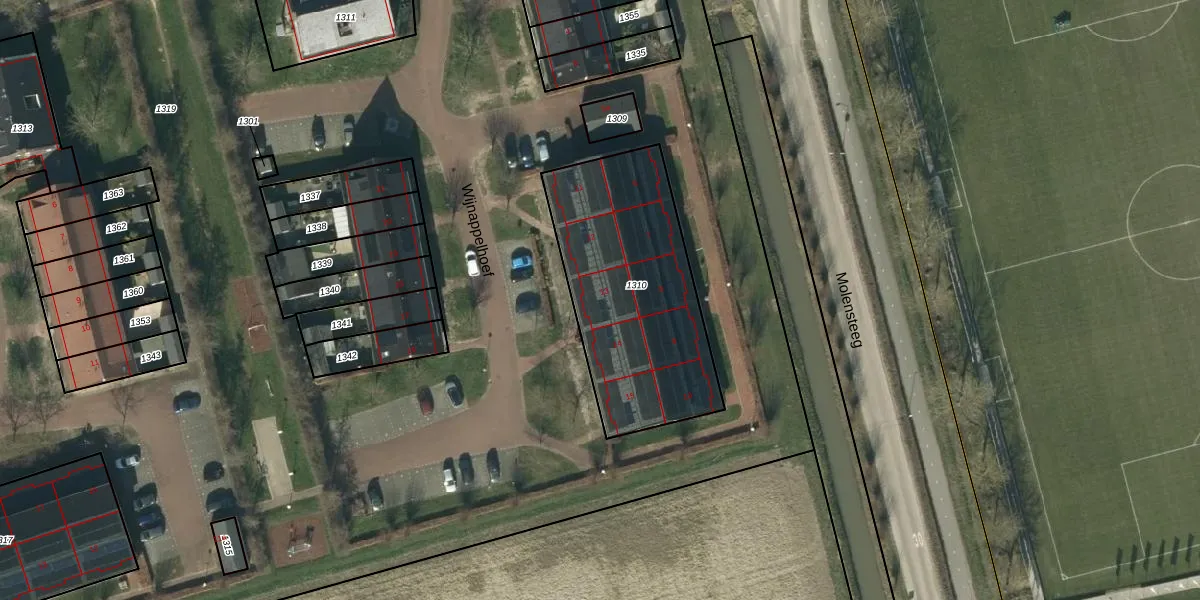 Het perceel waarop Wijnappelhoef 13 staat heeft een oppervlakte van 926 m². Dit is een groot perceel. De perceeloppervlakte wordt geregistreerd door het Kadaster. Gedetailleerde informatie over de maten van dit perceel kunt u vinden in het rapport Kadastrale kaart met maatvoering van Wijnappelhoef 13.