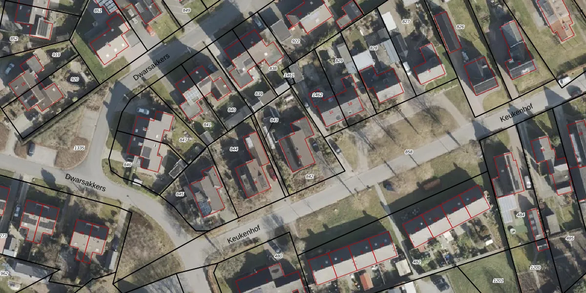 Het perceel waarop Keukenhof 1-b staat heeft een oppervlakte van 585 m². Dit is een groot perceel. De perceeloppervlakte wordt geregistreerd door het Kadaster. Gedetailleerde informatie over de maten van dit perceel kunt u vinden in het rapport Kadastrale kaart met maatvoering van Keukenhof 1-b.