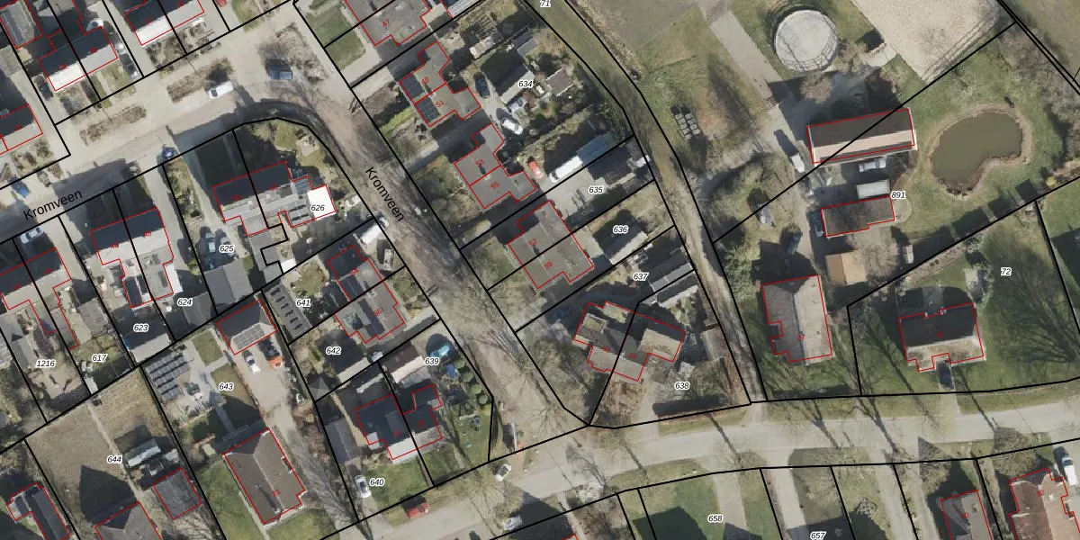 Het perceel waarop Kromveen 59 staat heeft een oppervlakte van 345 m². Dit is een groot perceel. De perceeloppervlakte wordt geregistreerd door het Kadaster. Gedetailleerde informatie over de maten van dit perceel kunt u vinden in het rapport Kadastrale kaart met maatvoering van Kromveen 59.