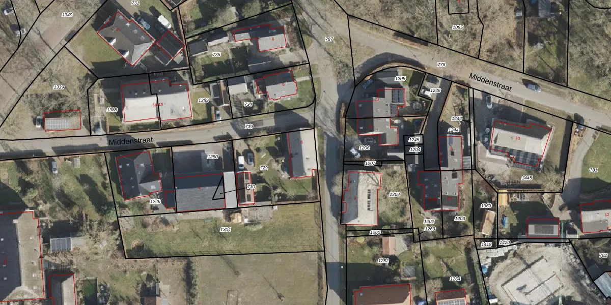 Het perceel waarop Middenstraat 6 staat heeft een oppervlakte van 593 m². Dit is een groot perceel. De perceeloppervlakte wordt geregistreerd door het Kadaster. Gedetailleerde informatie over de maten van dit perceel kunt u vinden in het rapport Kadastrale kaart met maatvoering van Middenstraat 6.