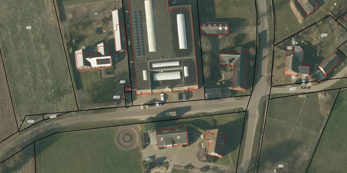 Het perceel waarop Keup 1-B staat heeft een oppervlakte van 3520 m². Dit is een zeer groot perceel. De perceeloppervlakte wordt geregistreerd door het Kadaster. Gedetailleerde informatie over de maten van dit perceel kunt u vinden in het rapport Kadastrale kaart met maatvoering van Keup 1-B.