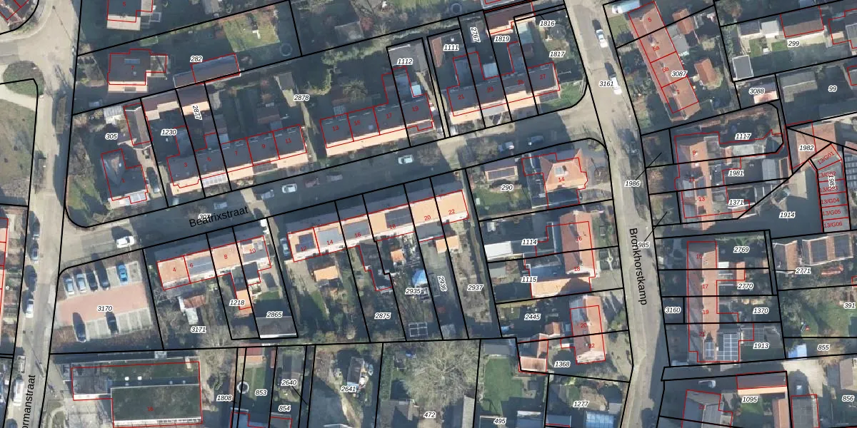 Het perceel waarop Beatrixstraat 20 staat heeft een oppervlakte van 237 m². Dit is een middelgroot perceel. De perceeloppervlakte wordt geregistreerd door het Kadaster. Gedetailleerde informatie over de maten van dit perceel kunt u vinden in het rapport Kadastrale kaart met maatvoering van Beatrixstraat 20.