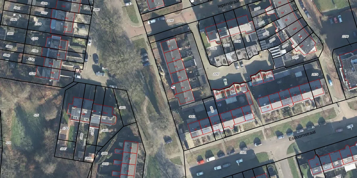 Het perceel waarop Eikenlaan 45 staat heeft een oppervlakte van 2897 m². Dit is een zeer groot perceel. De perceeloppervlakte wordt geregistreerd door het Kadaster. Gedetailleerde informatie over de maten van dit perceel kunt u vinden in het rapport Kadastrale kaart met maatvoering van Eikenlaan 45.
