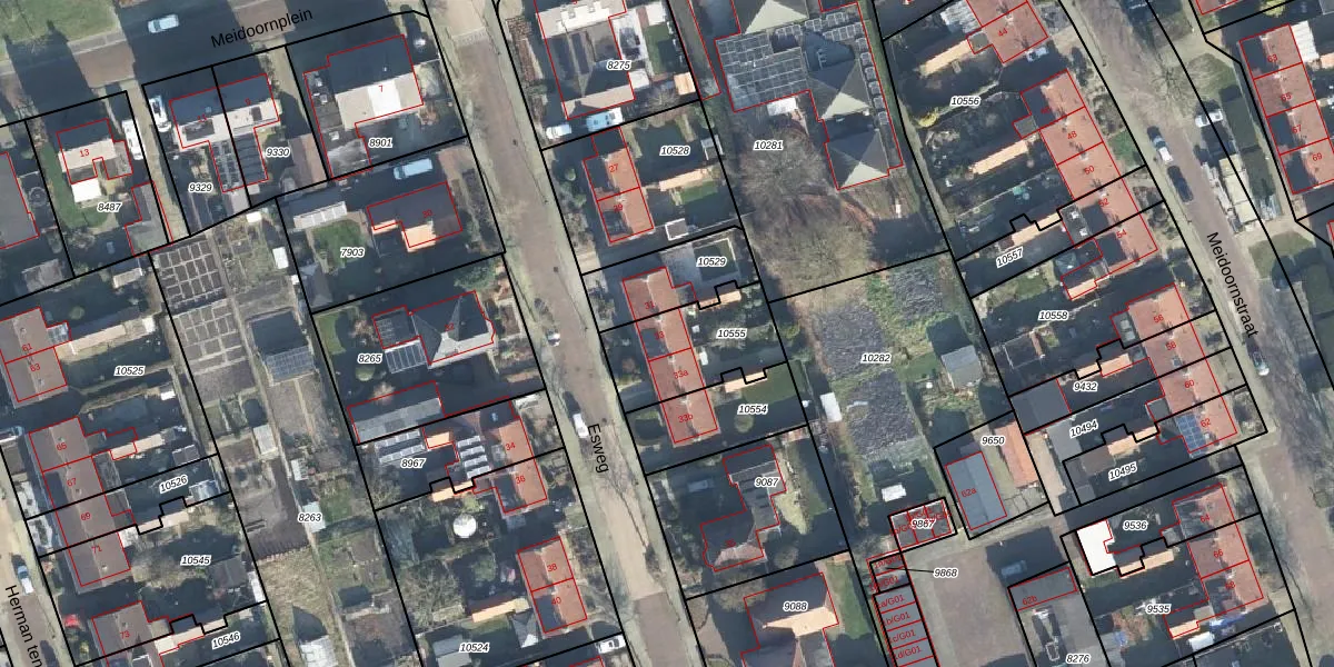 Het perceel waarop Esweg 33 staat heeft een oppervlakte van 330 m². Dit is een groot perceel. De perceeloppervlakte wordt geregistreerd door het Kadaster. Gedetailleerde informatie over de maten van dit perceel kunt u vinden in het rapport Kadastrale kaart met maatvoering van Esweg 33.