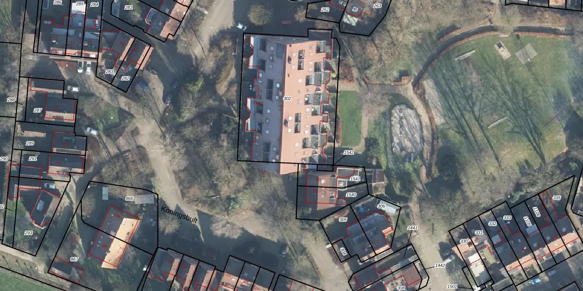Het perceel waarop Koningsbult 50 staat heeft een oppervlakte van 1470 m². Dit is een zeer groot perceel. De perceeloppervlakte wordt geregistreerd door het Kadaster. Gedetailleerde informatie over de maten van dit perceel kunt u vinden in het rapport Kadastrale kaart met maatvoering van Koningsbult 50.