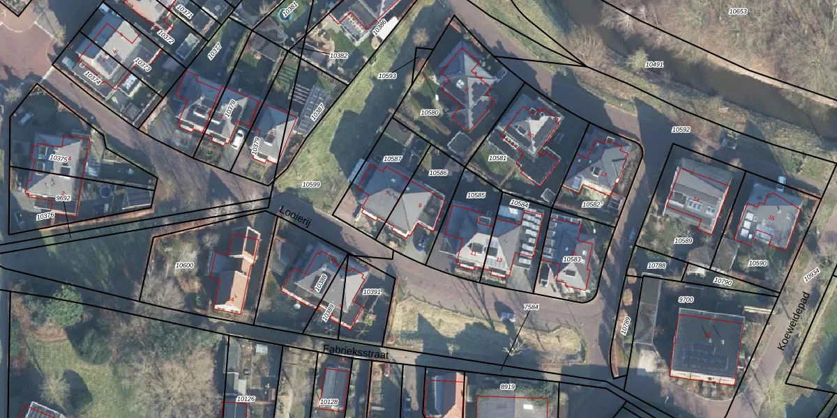 Looierij 9 is gelegen op kadastraal perceel EBG02D10586. Deze kadastrale aanduiding is uniek en wordt gebruikt door het Kadaster om eigendomsrechten en andere zakelijke rechten vast te leggen. Het perceel maakt onderdeel uit van de kadastrale gemeente Eibergen.
