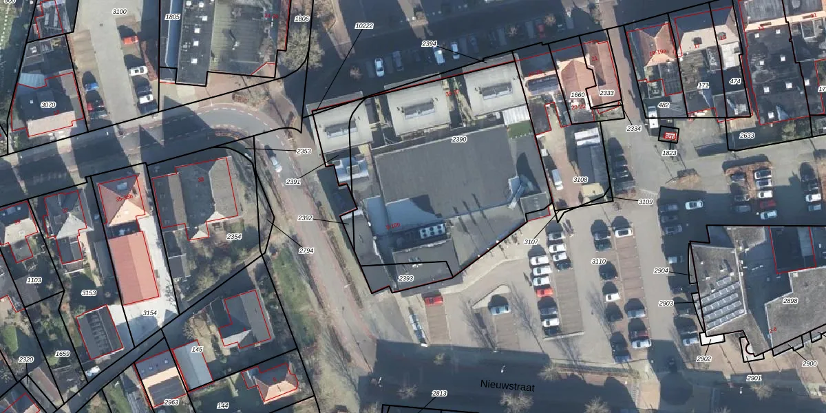 Het perceel waarop Nieuwstraat 8-a staat heeft een oppervlakte van 1883 m². Dit is een zeer groot perceel. De perceeloppervlakte wordt geregistreerd door het Kadaster. Gedetailleerde informatie over de maten van dit perceel kunt u vinden in het rapport Kadastrale kaart met maatvoering van Nieuwstraat 8-a.