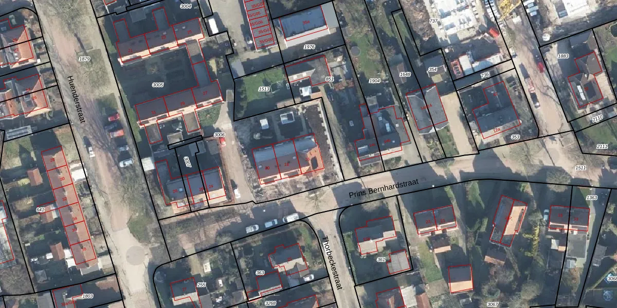 Het perceel waarop Prins Bernhardstraat 16 staat heeft een oppervlakte van 3044 m². Dit is een zeer groot perceel. De perceeloppervlakte wordt geregistreerd door het Kadaster. Gedetailleerde informatie over de maten van dit perceel kunt u vinden in het rapport Kadastrale kaart met maatvoering van Prins Bernhardstraat 16.