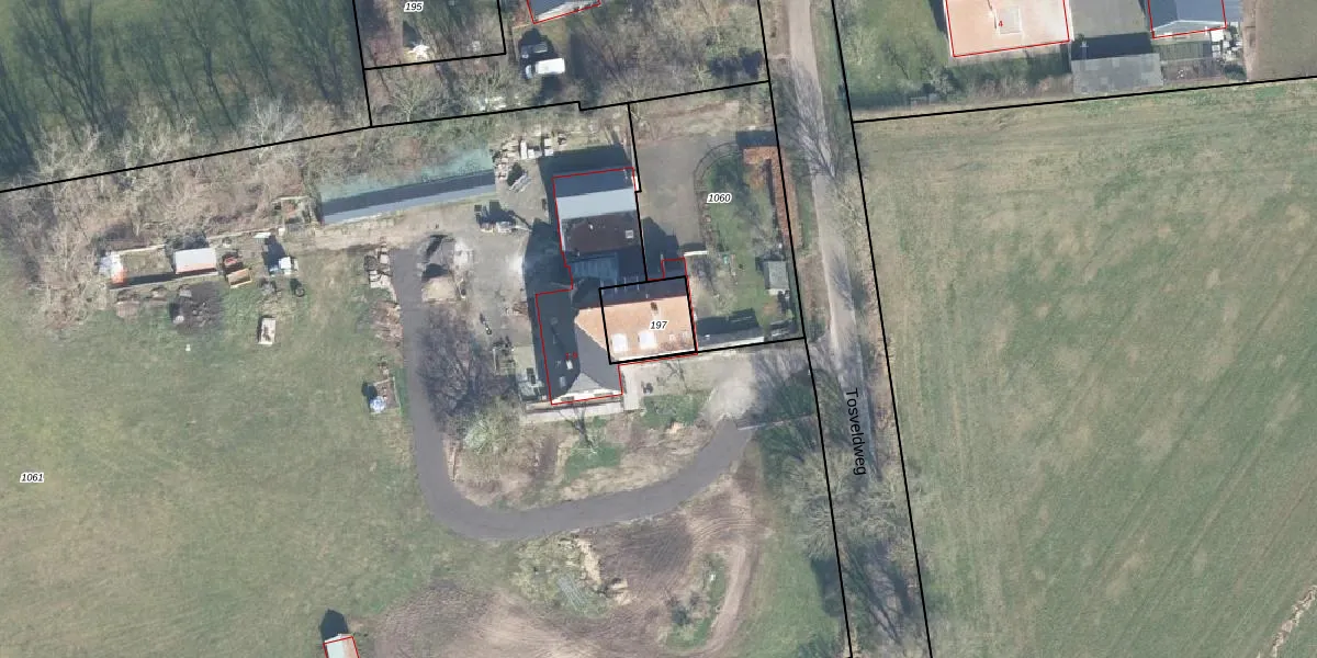 Tosveldweg 9 is gelegen op kadastraal perceel EBG02AA197. Deze kadastrale aanduiding is uniek en wordt gebruikt door het Kadaster om eigendomsrechten en andere zakelijke rechten vast te leggen. Het perceel maakt onderdeel uit van de kadastrale gemeente Eibergen.