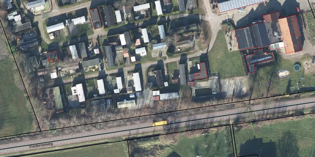 Het perceel waarop Vredenseweg 12-101 staat heeft een oppervlakte van 3,0 ha. Dit is een zeer groot perceel. De perceeloppervlakte wordt geregistreerd door het Kadaster. Gedetailleerde informatie over de maten van dit perceel kunt u vinden in het rapport Kadastrale kaart met maatvoering van Vredenseweg 12-101.