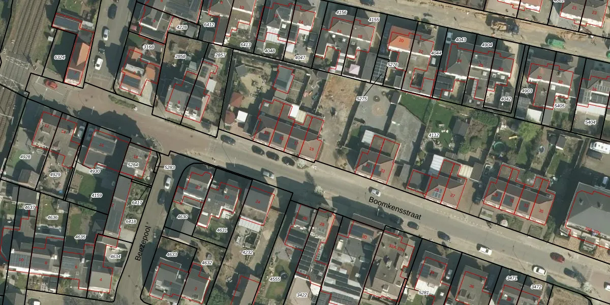 Het perceel waarop Boomkensstraat 19 staat heeft een oppervlakte van 5360 m². Dit is een zeer groot perceel. De perceeloppervlakte wordt geregistreerd door het Kadaster. Gedetailleerde informatie over de maten van dit perceel kunt u vinden in het rapport Kadastrale kaart met maatvoering van Boomkensstraat 19.